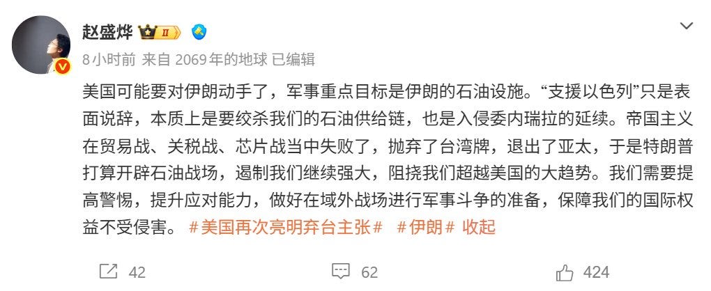 Zhao Shengye, a nationalist influencer and co-founder of the Honker Union of China hacker group, claims that Trump’s threats against Iran are an extension of Venezuela’s playbook, specifically an attempt to strangle China’s energy supply chain.
